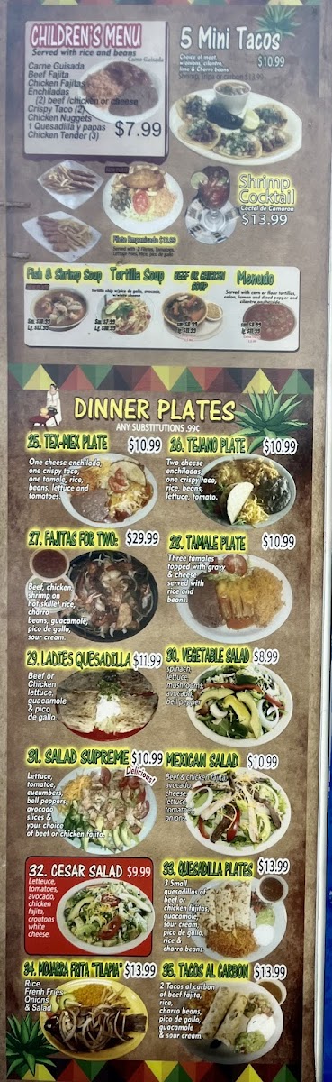 Pairs of hearty plates like the combination plate or the fajita plate with nopalitos offer fulfilling lunch or dinner choices, complemented by house-made sides like avocado slices, cactus, or flavorful pumpkin soup. chips and salsa are perfect for sharing while you settle in, enhancing the casual and friendly atmosphere.